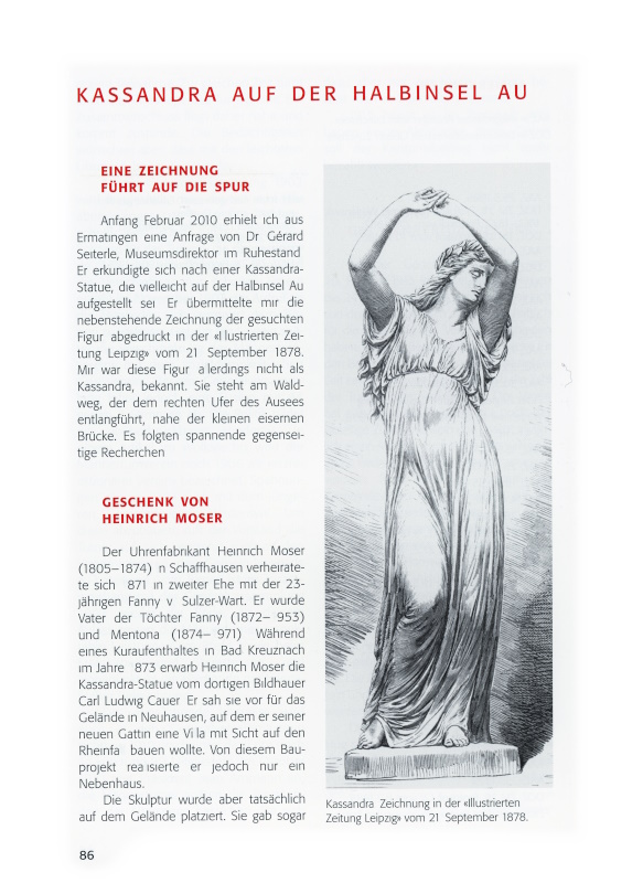 Weshalb Heinrich Moser seiner Frau Fanny ausgerechnet eine Kassandra-Statue geschenkt hat, ist nicht bekannt und bleibt das Geheimnis dieses Ehepaars. Doch, wer war Kassandra? Gemäss der griechischen Mythologie war sie die Tochter des trojanischen Königs Priamos. Laut Homer soll sie so bezaubernd gewesen sein wie Aphrodite. Der Gott Apollon verliebte sich in die Schöne und verlieh ihr die Gabe der Vorhersehung. Doch Kassandra verschmähte den Liebhaber. Dies erzürnte den olympischen Gott derart, dass er sie mit einem Fluch strafte: Niemand sollte ihren Prophezeiungen glauben. Vergeblich warnte Kassandra daher die Trojaner vor dem Trojanischen Pferd, der Hinterlist der Griechen, so dass Troja unterging.