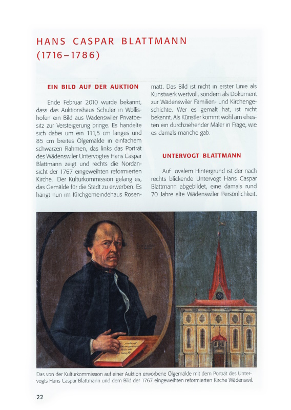 Ende Februar 2010 wurde bekannt, dass das Auktionshaus Schuler, Wollishofen ein Bild aus Wädenswiler Privatbesitz zur Versteigerung bringe. Es handelt sich dabei um ein 111.5 cm langes und 85 cm breites Ölgemälde in einfachem schwarzen Rahmen, das links das Porträt des Wädenswiler Untervogtes Hans Caspar Blattmann zeigt und rechts die Nordansicht der 1767 eingeweihten reformierten Kirche.1 Der Kulturkommission gelang es, das Gemälde für die Stadt zu erwerben. Es hängt nun im Kirchgemeindehaus Rosenmatt. Das Bild ist nicht in erster Linie als Kunstwerk wertvoll, sondern als Dokument zur Wädenswiler Familien- und Kirchengeschichte. Wer es gemalt hat ist nicht bekannt. Als Künstler kommt wohl am ehesten ein durchziehender Maler in Frage, wie es damals manche gab.