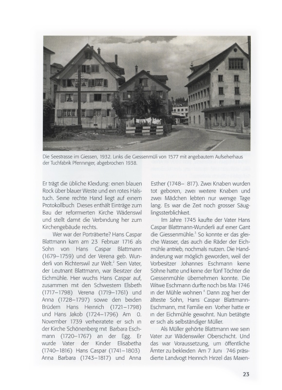 Wer war der Porträtierte? Hans Caspar Blattmann kam am 23. Februar 1716 als Sohn von Hans Caspar Blattmann (1679–1759) und der Verena geb. Wunderli von Richterswil zur Welt.2 Sein Vater, der Leutnant Blattmann, war Besitzer der Eichmühle. Hier wuchs Hans Caspar auf, zusammen mit den Schwestern Elsbeth (1717–1798), Verena (1719–1761) und Anna (1728–1797) sowie den beiden Brüdern Hans Heinrich (1721–1798) und Hans Jakob (1724–1796). Am 10. November 1739 verheiratete er sich in der Kirche Schönenberg mit Barbara Eschmann (1720–1767) an der Egg. Er wurde Vater der Kinder Elisabetha (1740–1816), Hans Caspar (1741–1803), Anna Barbara (1743–1817) und Anna Esther (1748–1817). Zwei Knaben wurden tot geboren, zwei weitere Knaben und zwei Mädchen lebten nur wenige Tage lang. Es war die Zeit der grossen Säuglingssterblichkeit.