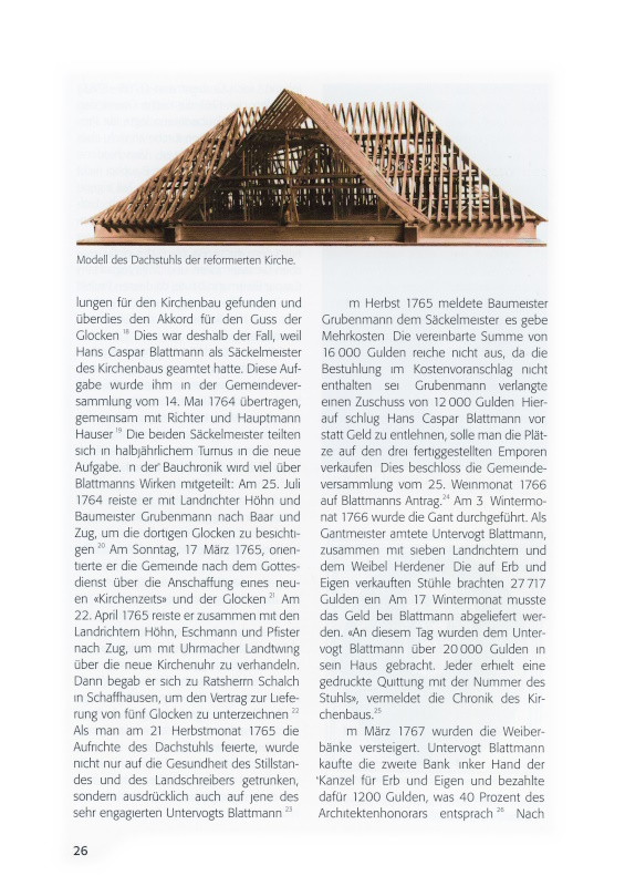 Dies war deshalb der Fall, weil Hans Caspar Blattmann als Säckelmeister des Kirchenbaus geamtet hatte. Diese Aufgabe wurde ihm in der Gemeindeversammlung vom 14. Mai 1764 übertragen, gemeinsam mit Richter und Hauptmann Hauser.19 Die beiden Säckelmeister teilten sich in halbjährlichem Turnus in die neue Aufgabe. In der Bauchronik wird viel über Blattmanns Wirken mitgeteilt: Am 25. Juli 1764 reiste er mit dem Landrichter Höhn und Baumeister Grubenmann nach Baar und Zug, um die dortigen Glocken zu besichtigen.20 Am Sonntag, 17. März 1765, orientierte er die Gemeinde nach dem Gottesdienst über die Anschaffung eines neuen «Kirchenzeits» und der Glocken.21 Am 22. April 1765 reiste er zusammen mit den Landrichtern Höhn, Eschmann und Pfister nach Zug, um mit Uhrmacher Landtwing über die neue Kirchenuhr zu verhandeln. Dann begab er sich zu Ratsherrn Schalch in Schaffhausen, um den Vertrag zur Lieferung von fünf Glocken zu unterzeichnen.22 Als man am 21. Herbstmonat 1765 die Aufrichte des Dachstuhls feierte, wurde nicht nur auf die Gesundheit des Stillstandes und des Landschreibers getrunken, sondern ausdrücklich auch auf jene des sehr engagierten Untervogts Blattmann.23