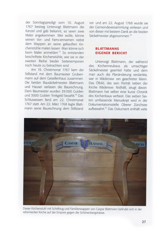 27 Dieser Kirchenstuhl mit Schriftzug und Familienwappen von Caspar Blattmann befindet sich in der reformierten Kirche auf der Empore gegen die Schönenbergstrasse.
