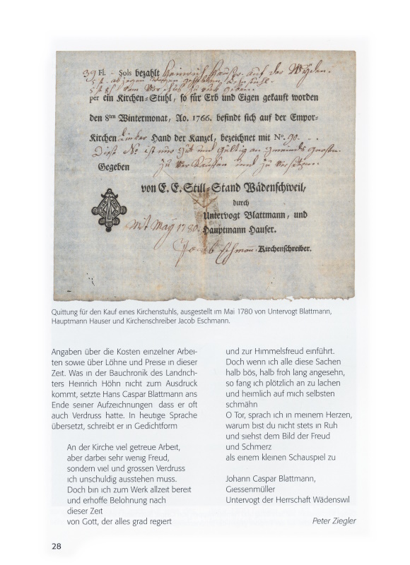 Im Herbst 1765 meldete Baumeister Grubenmann dem Säckelmeister, es gebe Mehrkosten. Die vereinbarte Summe von 16 000 Gulden reiche nicht aus, da die Bestuhlung im Kostenvoranschlag nicht enthalten sei. Grubenmann verlangte einen Zuschuss von 12 000 Gulden. Hierauf schlug Hans Caspar Blattmann vor, statt Geld zu entlehnen, solle man die Plätze auf den drei fertiggestellten Emporen verkaufen. Dies beschloss die Gemeindeversammlung vom 25. Weinmonat 1766 auf Blattmanns Antrag.24 Am 3. Wintermonat 1766 wurde die Gant durchgeführt. Als Gantmeister amtete Untervogt Blattmann, zusammen mit sieben Landrichtern und dem Weibel Herdener. Die auf Erb und Eigen verkauften Stühle brachten 27 717 Gulden ein. Am 17. Wintermonat musste das Geld bei Blattmann abgeliefert werden. «An diesem Tag wurden dem Untervogt Blattmann über 20 000 Gulden in sein Haus gebracht. Jeder erhielt eine gedruckte Quittung mit der Nummer des Stuhls», vermeldet die Chronik des Kirchenbaus.25