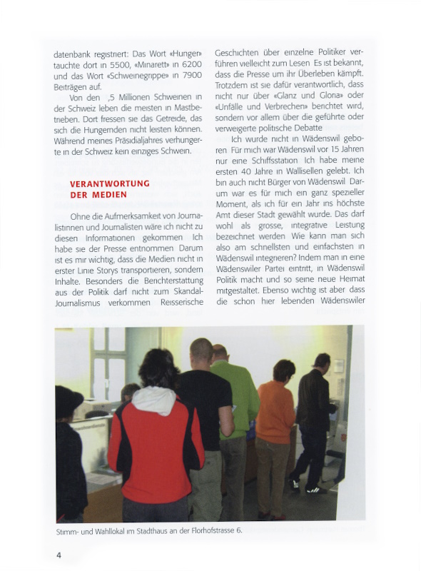 Wie stark uns die vier Minarette, die neun Schweinegrippetoten und die zehn Millionen Verhungerte beschäftigten, spiegeln die Medien. Und was während meines Präsidialjahres den Weg in die Medien fand, wird von der Schweizer Mediendatenbank registriert: Das Wort «Hunger» tauchte dort in 5500, «Minarett» in 6200 und das Wort «Schweinegrippe» in 7900 Beiträgen auf.
