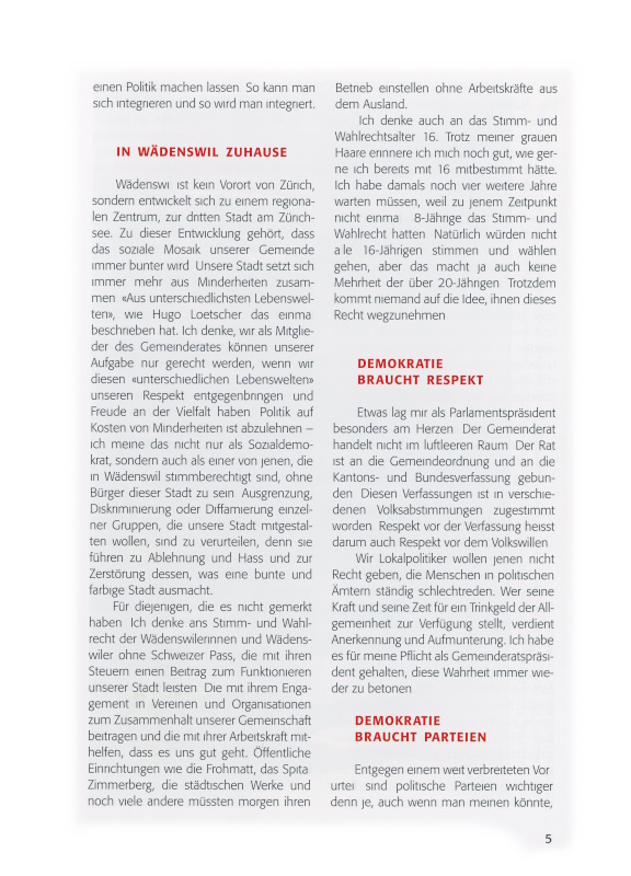 Unsere Gemeinde ist ein wunderbarer Ort, auch im schweizweiten Vergleich. Nicht nur als Wohn- und Bildungsstadt. Zu verdanken hat dies Wädenswil weitsichtig denkenden und handelnden Frauen und Männern, die sich an den unterschiedlichsten Orten engagiert haben und immer noch engagieren: in den Schulen, Kirchen und Vereinen, in Gewerkschaften, Verbänden und politischen Parteien. Lässt dieses Engagement nach, verliert Wädenswil mehr als nur ein paar Politiker. Die Stadt verspielt ihre Zukunftsfähigkeit. Stellen wir uns also gemeinsam unserer Verantwortung!