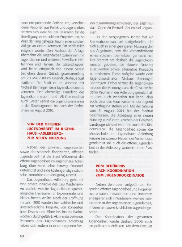 Dieser Veränderung hatte die Stadt Wädenswil bis dahin bereits Rechnung getragen. Das Team der offenen städtischen Jugendarbeit erhielt mehr Stellenprozente und ein Jugendtreff in der Au wurde schon in den Jahren davor als nötig erkannt und umgesetzt.
