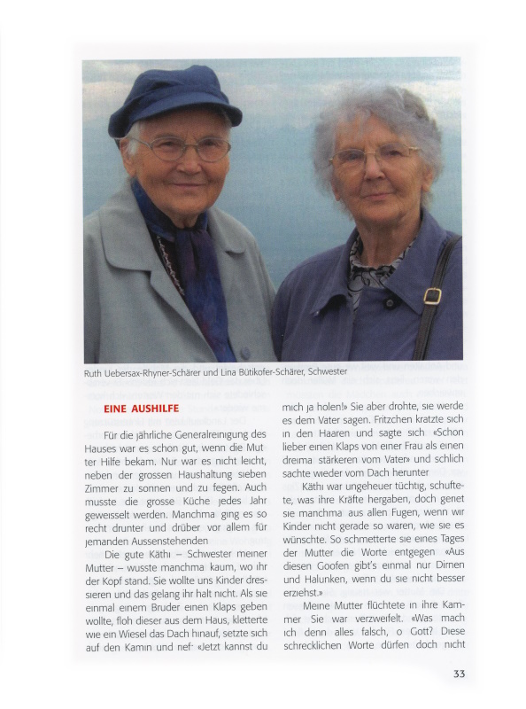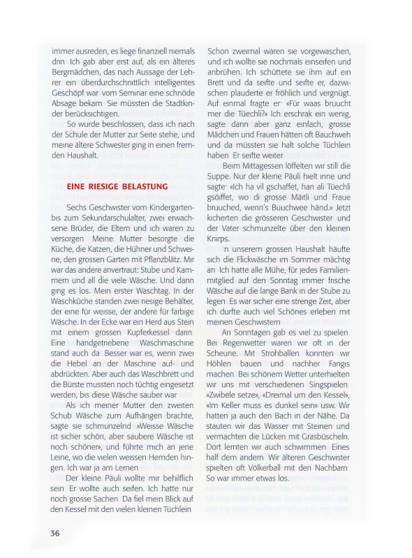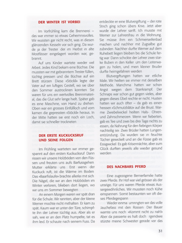 Einmal, als die Mutter und ich allein in der Küche arbeiteten, kam sie mir so still vor. Dann erzählte sie mir, dass sie grossen Kummer hätten, sie brächten den Zins auch nicht mehr zusammen. Letztes Jahr, als der Vater verspätet zinsen wollte, sagte der Bankverwalter, es sei schon in Ordnung gebracht worden, er dürfe ihm die Quittung überreichen. Nie erfuhren wir, wer das für uns bezahlt hatte. Wir vermuteten, der Verwalter selbst.