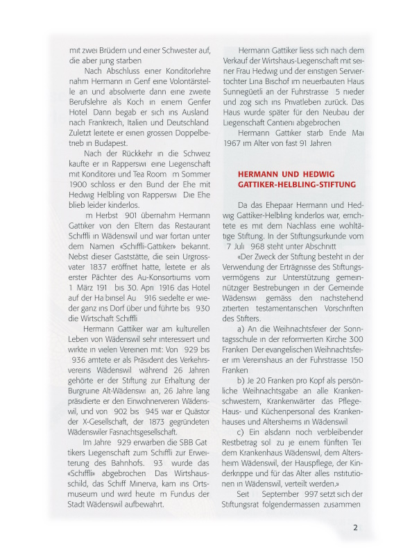Da das Ehepaar Hermann und Hedwig Gattiker-Helbling kinderlos war, errichtete es mit dem Nachlass eine wohltätige Stiftung. In der Stiftungsurkunde vom 17. Juli 1968 steht unter Abschnitt II: