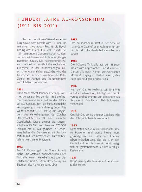 An der Jubiläums-Generalversammlung sowie dem Festakt vom 17. Juni und mit einem zweitägigen Fest für die Bevölkerung am 18./19. Juni 2011 blickte die 1911 gegründete Genossenschaft Au-Konsortium Wädenswil auf hundertjähriges Bestehen zurück. Die nachstehende Zusammenstellung erwähnt die wichtigsten Ereignisse in der hundertjährigen Geschichte. Ausführlicher gewürdigt wird das Geschehen in einer Broschüre, die Peter Ziegler im Auftrag des Au-Konsortiums zum Jubiläum verfasst hat.