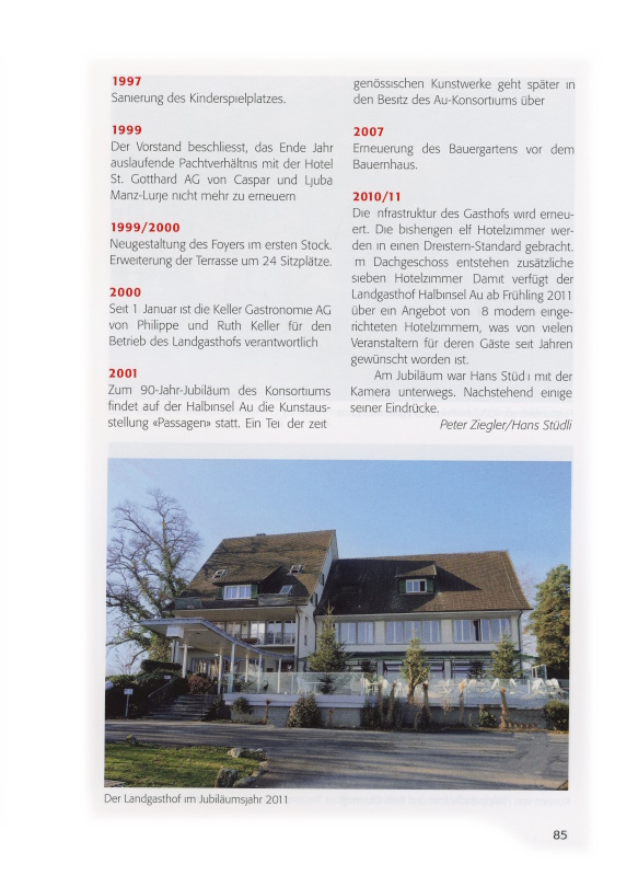 Zum 90-Jahr-Jubiläum des Konsortiums findet auf der Halbinsel Au die Kunstausstellung «Passagen» statt. Ein Teil der zeitgenössischen Kunstwerke geht später in den Besitz des Au-Konsortiums über.