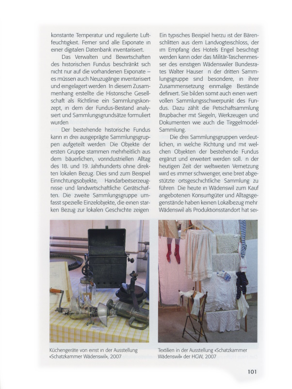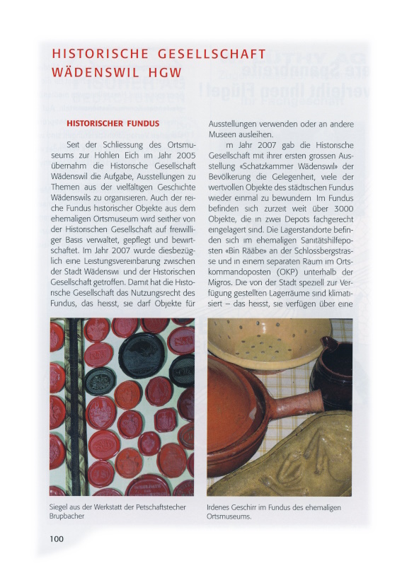 Dokumentationsstelle Oberer Zürichsee der Stadt Wädenswil erwähnt werden. Grundsätzlich gilt, dass im von der Historischen Gesellschaft verwalteten Fundus nur gegenständliche Objekte aufgenommen werden. Dokumente auf Papier, Handschriften, Fotografien, Bücher und Filme werden in der Dokumentationsstelle aufbewahrt. Die Historische Gesellschaft leitet entsprechende Objekte weiter und übernimmt im Gegenzug von der Dokumentationsstelle Exponate zur Aufbewahrung.