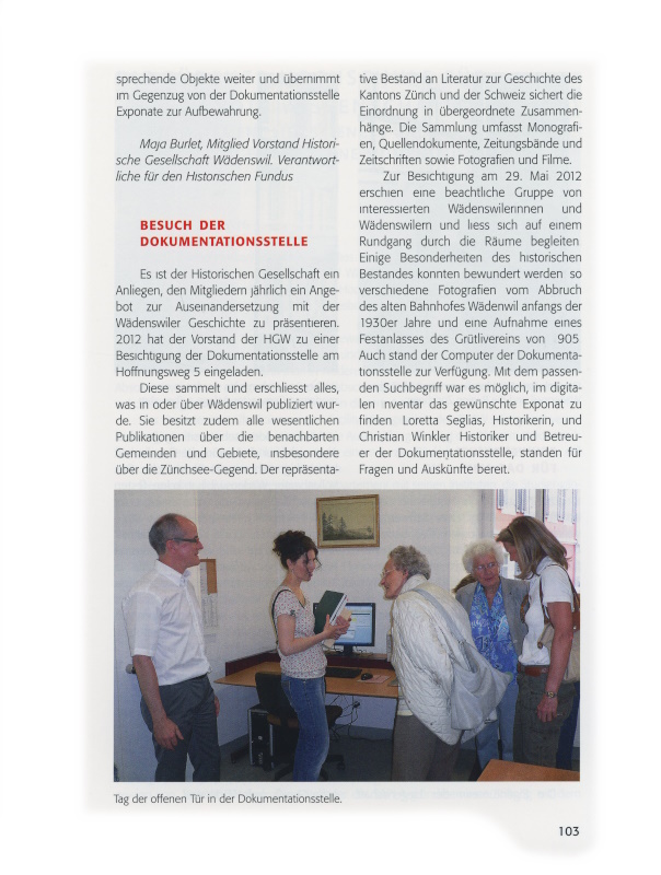 Es ist der Historischen Gesellschaft ein Anliegen, den Mitgliedern jährlich ein Angebot zur Auseinandersetzung mit der Wädenswiler Geschichte zu präsentieren. 2012 hat der Vorstand der HGW zu einer Besichtigung der Dokumentationsstelle am Hoffnungsweg 5 eingeladen.