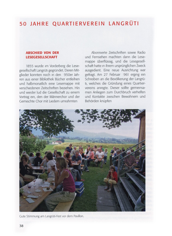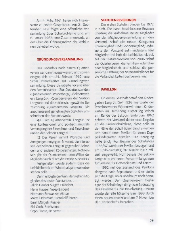 «§1 Der Quartierverein Langrüti ist eine konfessionell und politisch neutrale Vereinigung der Einwohner und Einwohnerinnen der Sektion Langrüti.