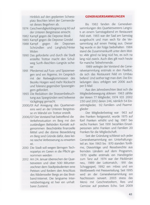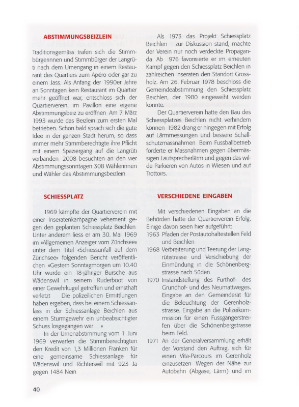 §2 Der Verein nimmt Wünsche und Anregungen entgegen. Er vertritt die Interessen der Sektion Langrüti gegenüber Behörden und anderen Körperschaften. Nötigenfalls gibt der Quartierverein dem Willen der Mitglieder auch durch die Presse Ausdruck.»