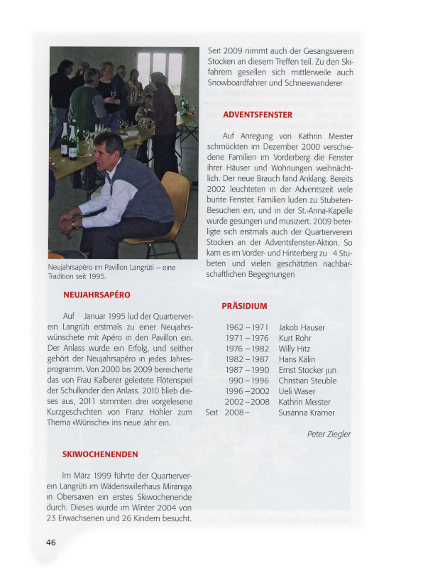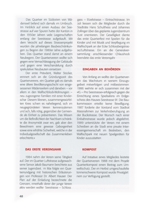 Der erste Präsident, Walter Stocker, erinnert sich an die Gründungszeit des Quartiervereins: «Im Quartier gab es damals eine ältere Bevölkerungsschicht von eingesessenen Wädenswilern und daneben – vor allem in den Walfischblock-Wohnungen – neu zugezogene Familien mit einer Kinderschar. Diesem kleinen, zusammengewürfelten Kreis schien es naheliegend, sich im neugegründeten Verein kennenzulernen und sich, falls nötig, gegenüber der Gemeinde als Einheit zu präsentieren. Das Wissen um die Befindlichkeit der Nachbarn schränkte die Anonymität zwar ein, gab aber den Bewohnern eine gewisse Geborgenheit sowie eine erhöhte Sicherheit, welche in der Individualgesellschaft das Zusammenleben erleichterte.»