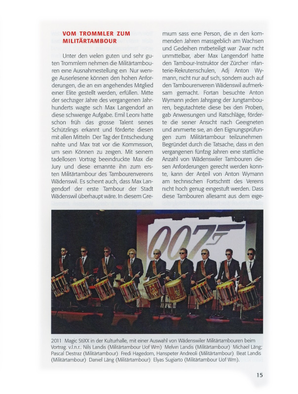 15 2011: Magic StiXX in der Kulturhalle, mit einer Auswahl von Wädenswiler Militärtambouren beim Vortrag. v.l.n.r.: Nils Landis (Militärtambour Uof Wm); Melvin Landis (Militärtambour); Michael Läng; Pascal Destraz (Militärtambour); Fredi Hagedorn; Hanspeter Andreoli (Militärtambour); Beat Landis (Militärtambour); Daniel Läng (Militärtambour); Elyas Sugiarto (Militärtambour Uof Wm).hauerkulisse am Fasnachtsumzug in Wädenswil.