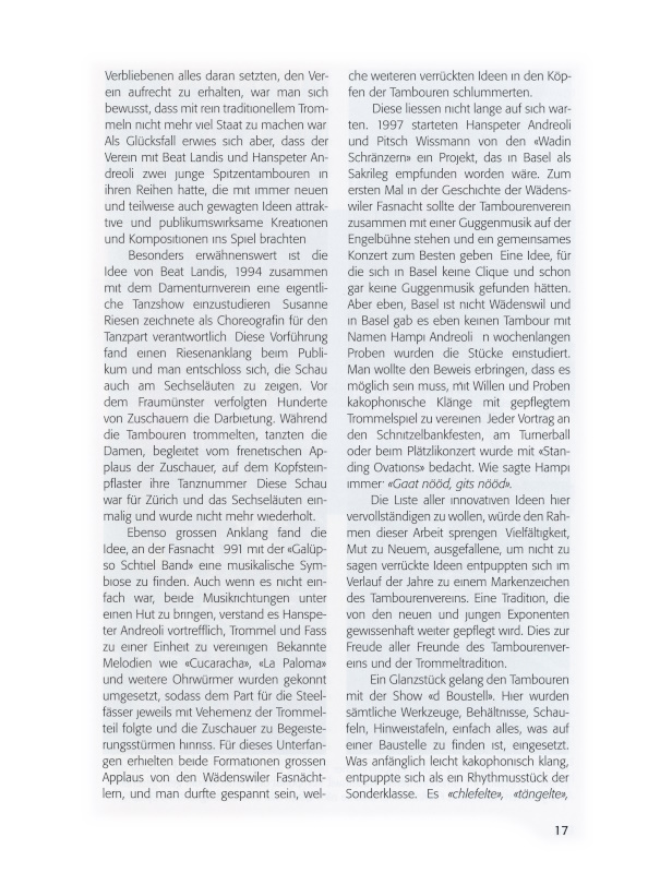 Die Liste aller innovativen Ideen hier vervollständigen zu wollen, würde den Rahmen dieser Arbeit sprengen. Vielfältigkeit, Mut zu Neuem, ausgefallene, um nicht zu sagen verrückte Ideen entpuppten sich im Verlauf der Jahre zu einem Markenzeichen des Tambourenvereins. Eine Tradition, die von den neuen und jungen Exponenten gewissenhaft weiter gepflegt wird. Dies zur Freude aller Freunde des Tambourenvereins und der Trommeltradition.