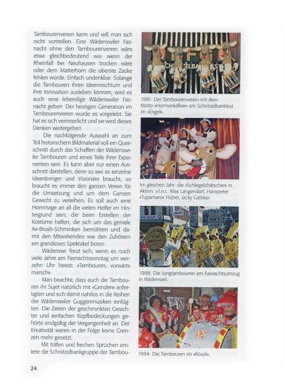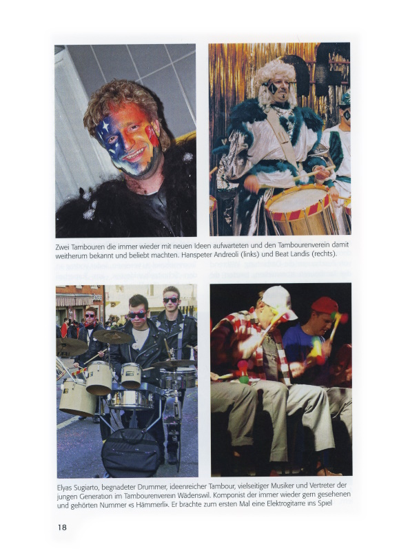 Ebenso grossen Anklang fand die Idee, an der Fasnacht 1991 mit der «Galüpso Schtiel Band» eine musikalische Symbiose zu finden. Auch wenn es nicht einfach war, beide Musikrichtungen unter einen Hut zu bringen, verstand es Hanspeter Andreoli vortrefflich, Trommel und Fass zu einer Einheit zu vereinigen. Bekannte Melodien wie «Cucaracha», «La Paloma» und weitere Ohrwürmer wurden gekonnt umgesetzt, sodass dem Part für die Steelfässer jeweils mit Vehemenz der Trommelteil folgte und die Zuschauer zu Begeisterungsstürmen hinriss. Für dieses Unterfangen erhielten beide Formationen grossen Applaus von den Wädenswiler Fasnächtlern, und man durfte gespannt sein, welche weiteren verrückten Ideen in den Köpfen der Tambouren schlummerten.