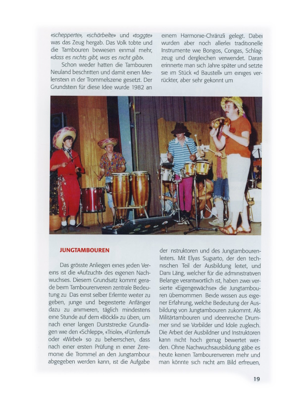 Schon wieder hatten die Tambouren Neuland beschritten und damit einen Meilenstein in der Trommelszene gesetzt. Der Grundstein für diese Idee wurde 1982 an einem Harmonie-Chränzli gelegt. Dabei wurden aber noch allerlei traditionelle Instrumente wie Bongos, Congas, Schlagzeug und dergleichen verwendet. Daran erinnerte man sich Jahre später und setzte sie im Stück «d Baustell» um einiges verrückter, aber sehr gekonnt um.