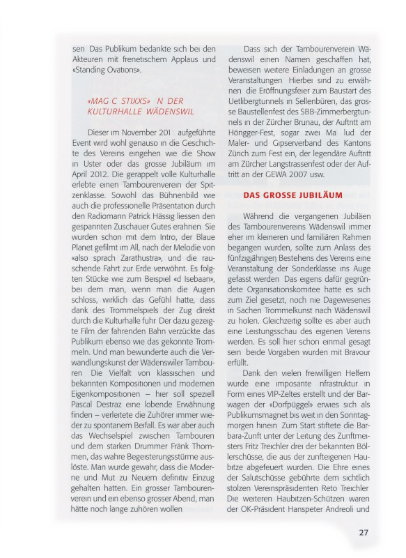 Dieser im November 2011 aufgeführte Event wird wohl genauso in die Geschichte des Vereins eingehen wie die Show in Uster oder das grosse Jubiläum im April 2012. Die gerappelt volle Kulturhalle erlebte einen Tambourenverein der Spitzenklasse. Sowohl das Bühnenbild wie auch die professionelle Präsentation durch den Radiomann Patrick Hässig liessen den gespannten Zuschauer Gutes erahnen. Sie wurden schon mit dem Intro, der Blaue Planet gefilmt im All, nach der Melodie von «also sprach Zarathustra», und die rauschende Fahrt zur Erde verwöhnt. Es folgten Stücke wie zum Beispiel «d Isebaan», bei dem man, wenn man die Augen schloss, wirklich das Gefühl hatte, dass dank des Trommelspiels der Zug direkt durch die Kulturhalle fuhr. Der dazu gezeigte Film der fahrenden Bahn verzückte das Publikum ebenso wie das gekonnte Trommeln. Und man bewunderte auch die Verwandlungskunst der Wädenswiler Tambouren. Die Vielfalt von klassischen und bekannten Kompositionen und modernen Eigenkompositionen – hier soll speziell Pascal Destraz eine lobende Erwähnung finden – verleitete die Zuhörer immer wieder zu spontanem Beifall. Es war aber auch das Wechselspiel zwischen Tambouren und dem starken Drummer Fränk Thommen, das wahre Begeisterungsstürme auslöste. Man wurde gewahr, dass die Moderne und Mut zu Neuem definitiv Einzug gehalten hatten. Ein grosser Tambourenverein und ein ebenso grosser Abend; man hätte noch lange zuhören wollen.