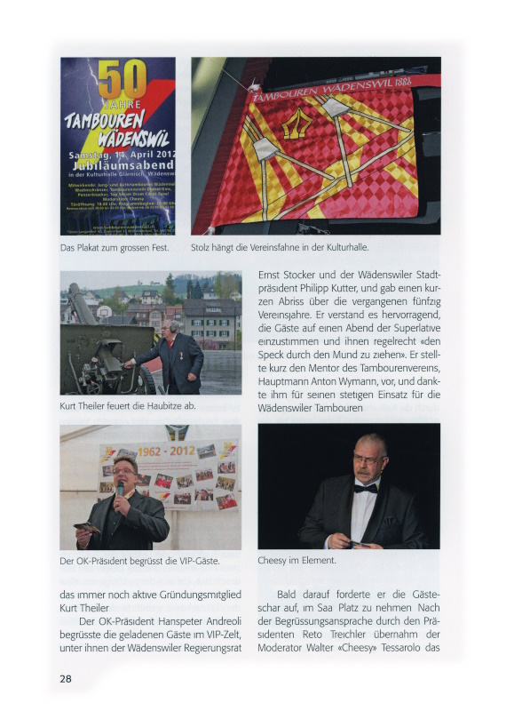 Der OK-Präsident Hanspeter Andreoli begrüsste die geladenen Gäste im VIP-Zelt, unter ihnen der Wädenswiler Regierungsrat Ernst Stocker und der Wädenswiler Stadtpräsident Philipp Kutter, und gab einen kurzen Abriss über die vergangenen fünfzig Vereinsjahre. Er verstand es hervorragend, die Gäste auf einen Abend der Superlative einzustimmen und ihnen regelrecht «den Speck durch den Mund zu ziehen». Er stellte kurz den Mentor des Tambourenvereins, Hauptmann Anton Wymann, vor, und dankte ihm für seinen stetigen Einsatz für die Wädenswiler Tambouren. Bald darauf forderte er die Gästeschar auf, im Saal Platz zu nehmen. Nach der Begrüssungsansprache durch den Präsidenten Reto Treichler übernahm der Moderator Walter «Cheesy» Tessarolo das Zepter auf der Bühne und führte gekonnt durch den Abend. Seine Moderationen versah er jeweils mit historischen und zum Teil humorvollen Fotografien, die manchen spontanen Lacher auslösten.