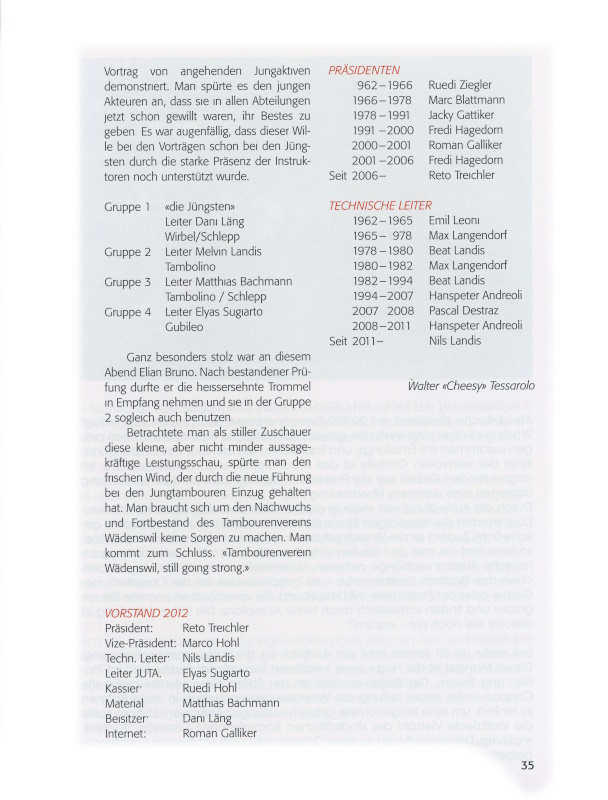 Das grösste Anliegen eines jeden Vereins ist die «Aufzucht» des eigenen Nachwuchses. Diesem Grundsatz kommt gerade beim Tambourenverein zentrale Bedeutung zu. Das einst selber Erlernte weiter zu geben, junge und begeisterte Anfänger dazu zu animieren, täglich mindestens eine Stunde auf dem «Böckli» zu üben, um nach einer langen Durststrecke Grundlagen wie den «Schlepp», «Triole», «Fünferruf» oder «Wirbel» so zu beherrschen, dass nach einer ersten Prüfung in einer Zeremonie die Trommel an den Jungtambour abgegeben werden kann, ist die Aufgabe der Instruktoren und des Jungtambourenleiters. Mit Elyas Sugiarto, der den technischen Teil der Ausbildung leitet, und Dani Läng, welcher für die administrativen Belange verantwortlich ist, haben zwei versierte «Eigengewächse» die Jungtambouren übernommen. Beide wissen aus eigener Erfahrung, welche Bedeutung der Ausbildung von Jungtambouren zukommt. Als Militärtambouren und ideenreiche Drummer sind sie Vorbilder und Idole zugleich. Die Arbeit der Ausbildner und Instruktoren kann nicht hoch genug bewertet werden. Ohne Nachwuchsausbildung gäbe es heute keinen Tambourenverein mehr und man könnte sich nicht am Bild erfreuen, wenn Gründungsmitglieder mit Knaben und Mädchen auf der Bühne stehen und zusammen ein Trommelstück zum Besten geben. Die Jungtambouren sind die Zukunft des Vereins, auch wenn der Weg zum Aktivtambour steinig und schwer ist.