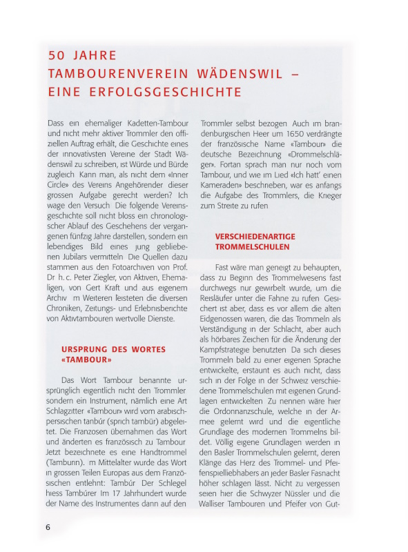 Dass ein ehemaliger Kadetten-Tambour und nicht mehr aktiver Trommler den offiziellen Auftrag erhält, die Geschichte eines der innovativsten Vereine der Stadt Wädenswil zu schreiben, ist Würde und Bürde zugleich. Kann man, als nicht dem «Inner Circle» des Vereins Angehörender, dieser grossen Aufgabe gerecht werden? Ich wage den Versuch! Die folgende Vereinsgeschichte soll nicht bloss ein chronologischer Ablauf des Geschehens der vergangenen fünfzig Jahre darstellen, sondern ein lebendiges Bild eines jung gebliebenen Jubilars vermitteln. Die Quellen dazu stammen aus den Fotoarchiven von Prof. Dr. h.c. Peter Ziegler, von Aktiven, Ehemaligen, von Gert Kraft und aus eigenem Archiv. Im Weiteren leisteten die diversen Chroniken, Zeitungs- und Erlebnisberichte von Aktivtambouren wertvolle Dienste.