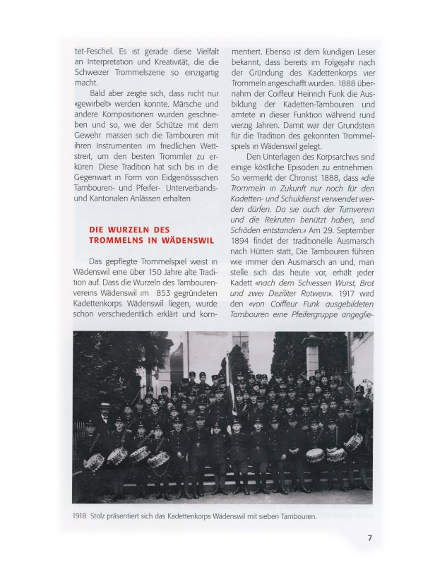 Das gepflegte Trommelspiel weist in Wädenswil eine über 150 Jahre alte Tradition auf. Dass die Wurzeln des Tambourenvereins Wädenswil im 1853 gegründeten Kadettenkorps Wädenswil liegen, wurde schon verschiedentlich erklärt und kommentiert. Ebenso ist dem kundigen Leser bekannt, dass bereits im Folgejahr nach der Gründung des Kadettenkorps vier Trommeln angeschafft wurden. 1888 übernahm der Coiffeur Heinrich Funk die Ausbildung der Kadetten-Tambouren und amtete in dieser Funktion während rund vierzig Jahren. Damit war der Grundstein für die Tradition des gekonnten Trommelspiels in Wädenswil gelegt.