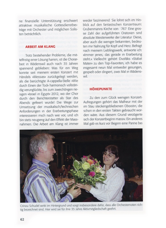 Trotz bestehender Probleme, die mittelfristig einer Lösung harren, ist die Chorarbeit in Wädenswil auch nach 35 Jahren spannend geblieben: Was für ein Weg konnte seit meinem ersten Konzert mit Händels «Messias» zurückgelegt werden, als die berüchtigte a-cappella-Stelle «Wie durch Einen der Tod» harmonisch vollständig verunglückte, bis zum zweichörigen riesigen «Israel in Egypt» 2012, wo der Chor durch den Berichterstatter als Star des Abends gefeiert wurde! Die Wege zur Umsetzung der musikalisch / technischen Anforderungen in der Erarbeitungsphase interessieren mich nach wie vor, und ich bin stets neugierig auf den Effekt der Massnahmen. Die Arbeit am Klang ist immer wieder faszinierend! Sie lohnt sich im Hinblick auf den fantastischen Konzertraum: Grubenmanns Kirche von 1767. Eine grosse Zahl der aufgeführten Oratorien sind absolute Meisterwerke der Literatur. Diese, aber auch die weniger bekannten bedeuten mir Nahrung für Kopf und Herz. Befragt nach meinem Lieblingswerk, antworte ich: «Immer jenes, das gerade in Erarbeitung steht.» Vielleicht gehört Dvoráks Stabat Mater zu den Top-Favoriten, ich habe es insgesamt neun Mal entweder gesungen, gespielt oder dirigiert, zwei Mal in Wädenswil.