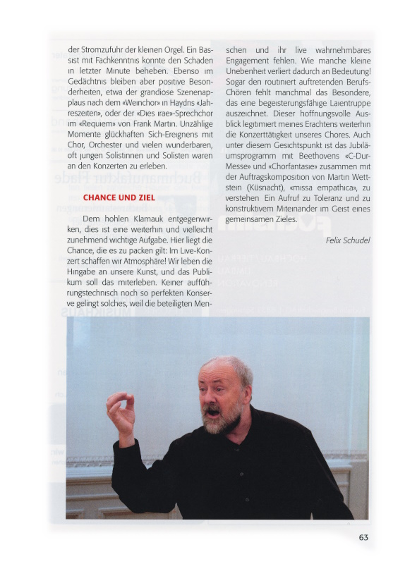 Dem hohlen Klamauk entgegenwirken, dies ist eine weiterhin und vielleicht zunehmend wichtige Aufgabe. Hier liegt die Chance, die es zu packen gilt: Im Live-Konzert schaffen wir Atmosphäre! Wir leben die Hingabe an unsere Kunst, und das Publikum soll das miterleben. Keiner aufführungs-technisch noch so perfekten Konserve gelingt solches, weil die beteiligten Menschen und ihr live wahrnehmbares Engagement fehlen. Wie manche kleine Unebenheit verliert dadurch an Bedeutung! Sogar den routiniert auftretenden Berufs-Chören fehlt manchmal das Besondere, das eine begeisterungsfähige Laientruppe auszeichnet. Dieser hoffnungsvolle Ausblick legitimiert meines Erachtens weiterhin die Konzerttätigkeit unseres Chores. Auch unter diesem Gesichtspunkt ist das Jubiläumsprogramm mit Beethovens C-Dur-Messe und Chorfantasie zusammen mit der Auftragskomposition von Martin Wettstein (Küsnacht), «missa empathica», zu verstehen: Ein Aufruf zu Toleranz und zu konstruktivem Miteinander im Geist eines gemeinsamen Zieles.