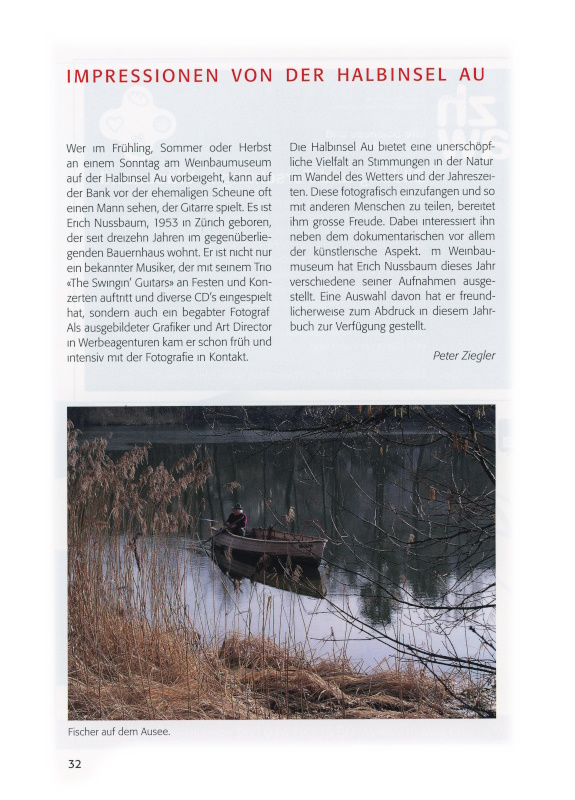 Wer im Frühling, Sommer oder Herbst an einem Sonntag am Weinbaumuseum auf der Halbinsel Au vorbeigeht, kann auf der Bank vor der ehemaligen Scheune oft einen Mann sehen, der Gitarre spielt. Es ist Erich Nussbaum, 1953 in Zürich geboren, der seit dreizehn Jahren im gegenüberliegenden Bauernhaus wohnt. Er ist nicht nur ein bekannter Musiker der mit seinem Trio «The Swingin’ Guitars» an Festen und Konzerten auftritt und diverse CD’s eingespielt hat, sondern auch ein begabter Fotograf. Als ausgebildeter Grafiker und Art Director in Werbeagenturen kam er schon früh und intensiv mit der Fotografie in Kontakt.