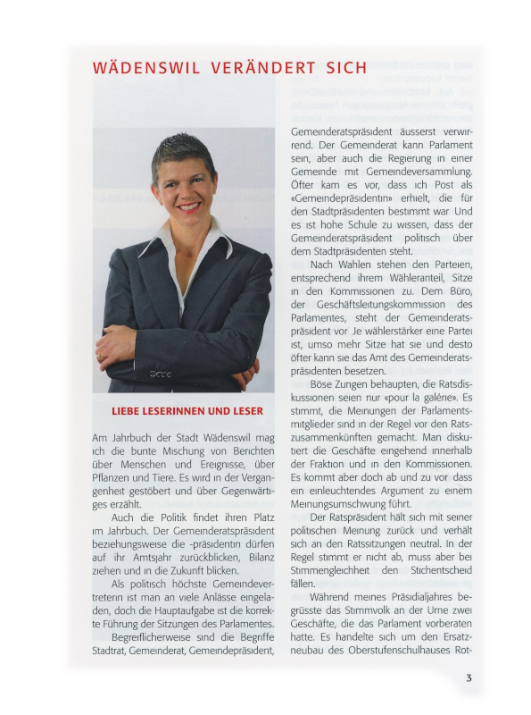 Jahrbuch. Der Gemeinderatspräsident beziehungsweise die -präsidentin dürfen auf ihr Amtsjahr zurückblicken, Bilanz ziehen und in die Zukunft blicken.