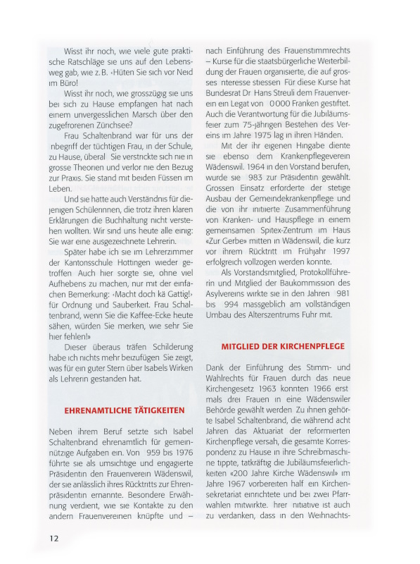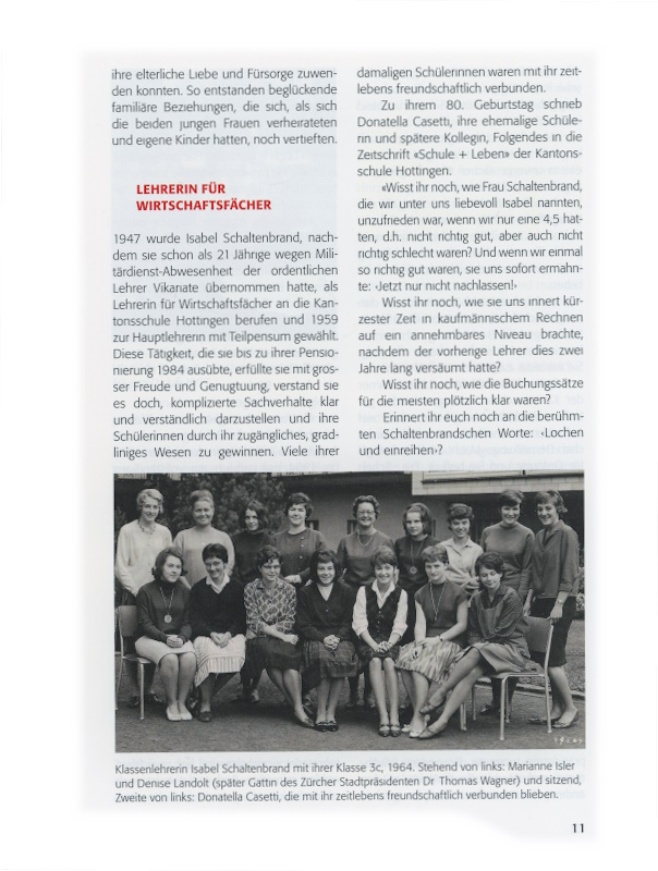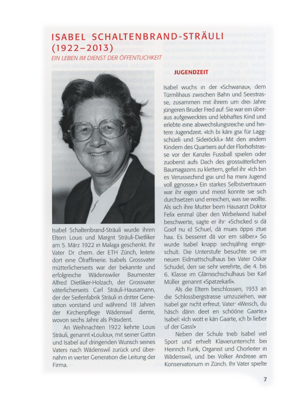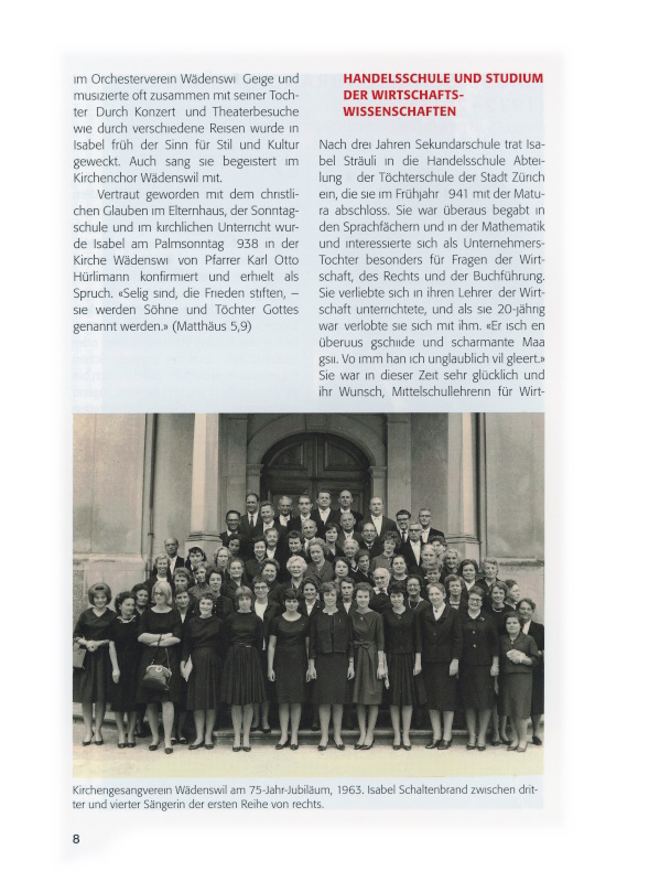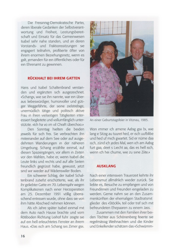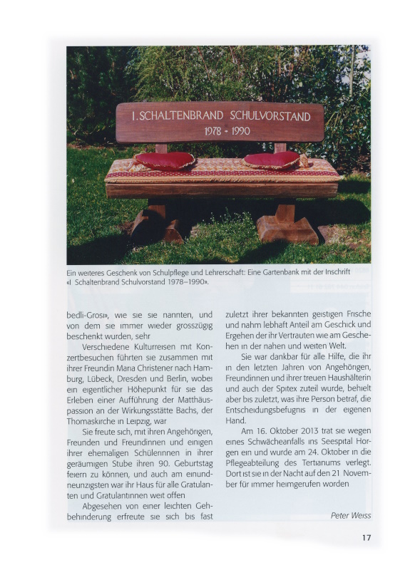 Sie war dankbar für alle Hilfe, die ihr in den letzten Jahren von Angehörigen, Freundinnen und ihrer treuen Haushälterin und auch der Spitex zuteil wurde, behielt aber bis zuletzt, was ihre Person betraf, die Entscheidungsbefugnis in der eigenen Hand.