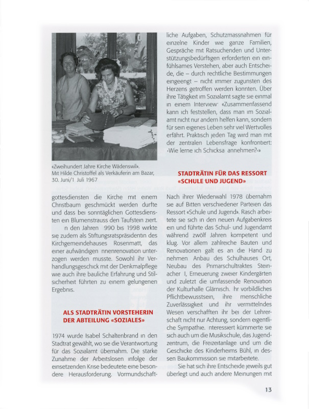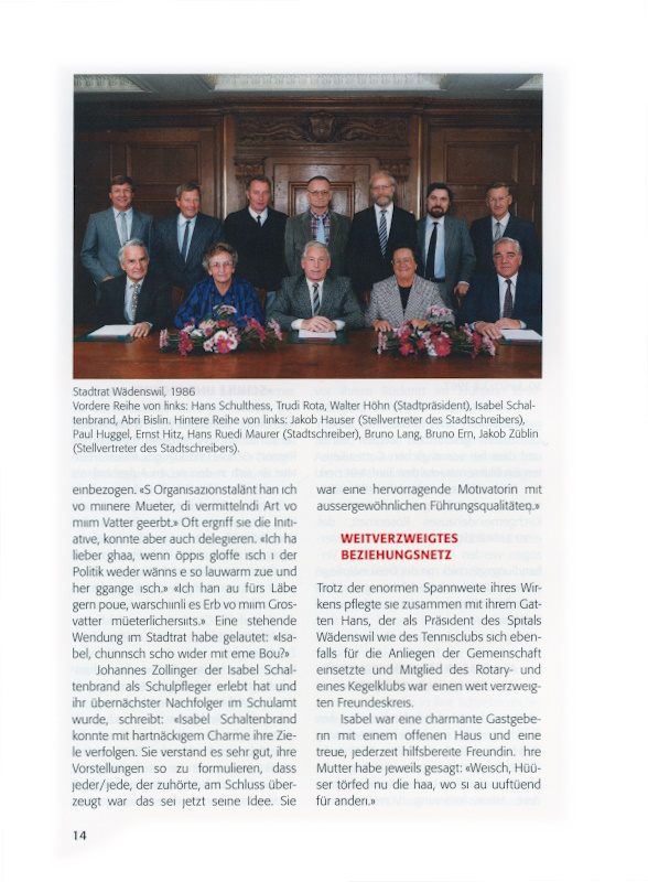 Nach einer intensiven Trauerzeit kehrte ihr Lebensmut allmählich wieder zurück. Sie liebte es, Besuche zu empfangen und von Freundinnen und Freunden eingeladen zu werden. Gerne nahm sie an den Zusammenkünften der ehemaligen Stadtratsmitglieder, des «Stöckli», teil oder traf sich mit befreundeten Ehepaaren zu einem Jass.