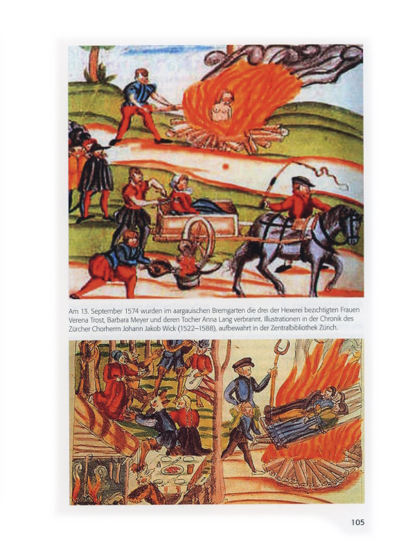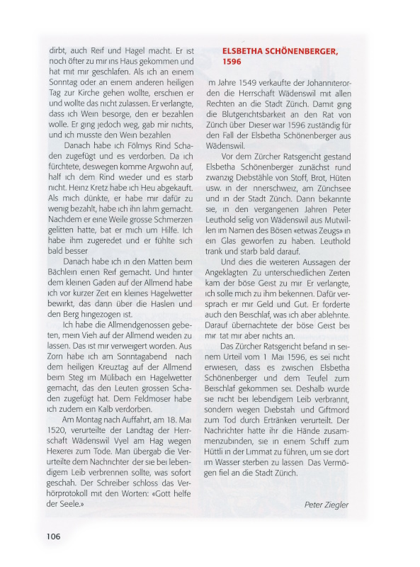 3 Und dies war ihr Geständnis vor dem Landtag der Johanniterkomturei Wädenswil: Als ich von Einsiedeln heimkehrte und auf die Allmend (Richterswil) kam, begegnete mir ein Mann in einem hübschen schwarzen Kleid, mit einer Feder am Hut und einem grossen Bündel Geld im Busen. Unter dem Arm trug er ein mit Gürteln gefülltes Kästchen. Er bat mich um den Beischlaf und versprach mir dafür viele Güter. Da ich arm war und Kinder hatte, willigte ich ein. Ich führte ihn zu mir heim, tat seinen Willen und lag bei ihm. Danach begehrte er, dass ich Gott, die heilige Mutter Maria und alle Heiligen verleugne, fortan nur ihm diene und tue, was er gebiete. Dafür wolle er mir Gutes tun und mir geben, was ich wünsche. Später hat er mich gelehrt, wie man Leute und Gut verdirbt, auch Reif und Hagel macht. Er ist noch öfter zu mir ins Haus gekommen und hat mit mir geschlafen. Als ich an einem Sonntag oder an einem anderen heiligen Tag zur Kirche gehen wollte, erschien er und wollte das nicht zulassen. Er verlangte, dass ich Wein besorge, den er bezahlen wolle. Er ging jedoch weg, gab mir nichts, und ich musste den Wein bezahlen.