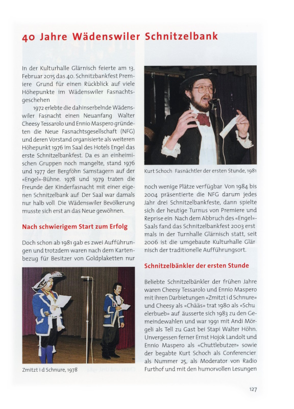 1972 erlebte die dahinserbelnde Wädenswiler Fasnacht einen Neuanfang: Walter Cheesy Tessarolo und Ennio Maspero gründeten die Neue Fasnachtsgesellschaft (NFG) und deren Vorstand organisierte als weiteren Höhepunkt 1976 im Saal des Hotels Engel das erste Schnitzelbankfest. Da es an einheimischen Gruppen noch mangelte, stand 1976 und 1977 der Bergföhn Samstagern auf der «Engel»-Bühne. 1978 und 1979 traten die Freunde der Kinderfasnacht mit einer eigenen Schnitzelbank auf. Der Saal war damals nur halb voll. Die Wädenswiler Bevölkerung musste sich erst an das Neue gewöhnen.