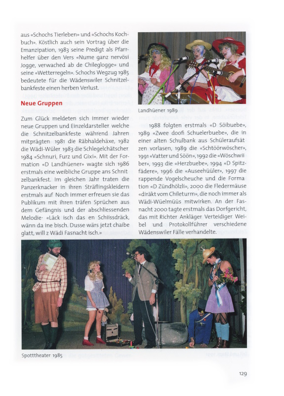 1988 folgten erstmals «D Söibuebe», 1989 «Zwee doofi Schuelerbuebe», die in einer alten Schulbank aus Schüleraufsätzen vorlasen, 1989 die «Schtöörwöscher», 1991 «Vatter und Söön», 1992 die «Wöschwiiber», 1993 die «Herzbuebe», 1994 «D Spitzfädere», 1996 die «Auseehüüler», 1997 die rappende Vogelscheuche und die Formation «D Zündhölzli», 2000 die Fledermäuse «diräkt vom Chileturm», die noch immer als Wädi-Wüelmüüs mitwirken. An der Fasnacht 2000 tagte erstmals das Dorfgericht, das mit Richter, Ankläger, Verteidiger, Weibel und Protokollführer verschiedene Wädenswiler Fälle verhandelte.