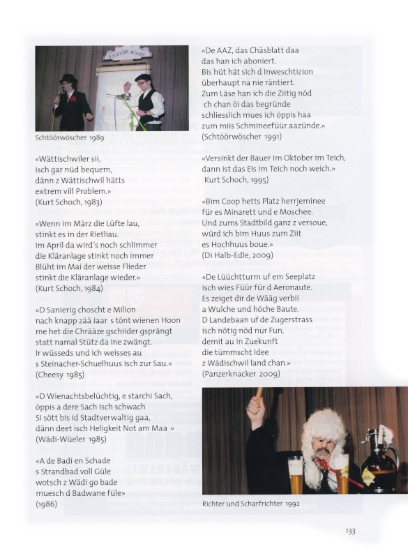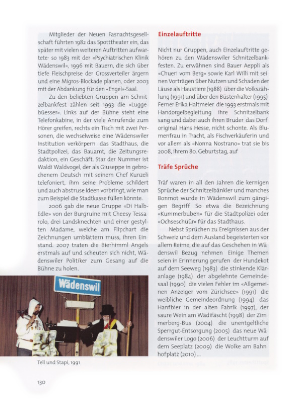 Träf waren in all den Jahren die kernigen Sprüche der Schnitzelbänkler und manches Bonmot wurde in Wädenswil zum gängigen Begriff. So etwa die Bezeichnung «Kummerbuben» für die Stadtpolizei oder «Ochseschüür» für das Stadthaus.