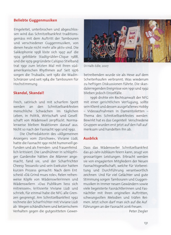 Dass das Wädenswiler Schnitzelbankfest das 40-Jahr-Jubliäum feiern kann, zeugt von grossartigen Leistungen. Erbracht werden sie von engagierten Mitgliedern der Neuen Fasnachtsgesellschaft, welche für Vorbereitung und Durchführung verantwortlich zeichnen. Und für viel Gelächter und gute Stimmung sorgen Tambouren und Guggenmusiken in immer neuen Gewändern sowie viele begeisterte Fasnächtlerinnen und Fasnächtler mit ihren originellen Auftritten, schwungvollen Melodien und träfen Reimen. Jetzt schon darf man sich auf die Aufführungen an der Fasnacht 2016 freuen.