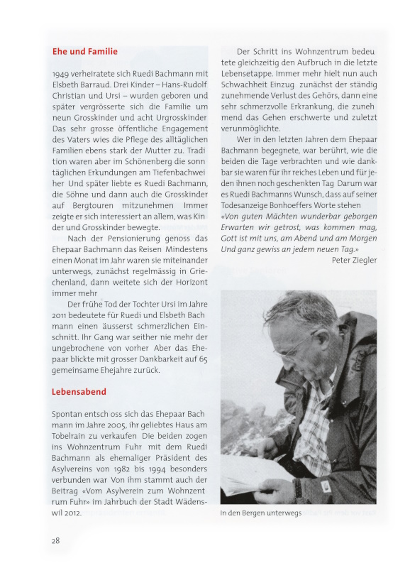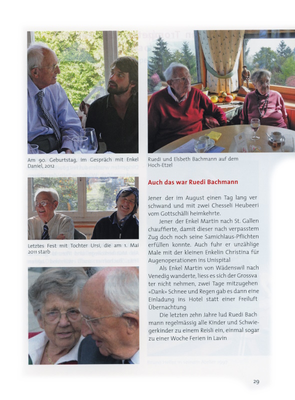 Der frühe Tod der Tochter Ursi im Jahre 2011 bedeutete für Ruedi und Elsbeth Bachmann einen äusserst schmerzlichen Einschnitt. Ihr Gang war seither nie mehr der ungebrochene von vorher. Aber das Ehepaar blickte mit grosser Dankbarkeit auf 65 gemeinsame Ehejahre zurück.