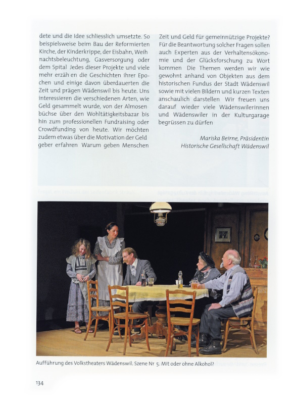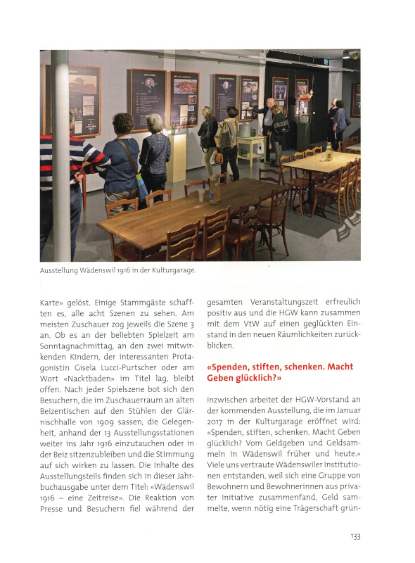 In den letzten Wochen des Jahres arbeiteten die Mitglieder der beiden Vereine HGW und VtW, die beiden Hauptmieter der Kulturgarage, auf Hochtouren an den Vorbereitungen für ihre geplante Co-Produktion «Wädenswil 1916 – eine Inszenierung». Theater und historische Ausstellung wurden in diesem Konzept miteinander verschmolzen. Bereits im Sommer hatten Mariska Beirne (Kuratorin) und Christian Winkler (Historische Recherche) viele Stunden im Archiv zugebracht und 13 Protagonisten aus unterschiedlichen Bevölkerungsgruppen ausgewählt, die Wädenswil vor hundert Jahren geprägt hatten. Ihre Resultate leiteten sie an die Autorin und Regisseurin Esther Huss weiter, welche aus diesen Informationen acht unterhaltsame Spielszenen schrieb. Wer Ende November an der Kulturgarage vorbeispazierte, sah die Schauspieler des Volkstheaters unter ihrer Leitung proben. Wie sich die Kulturgarage aber vor Weihnachten immer mehr zu füllen begann, wurden die Rollos und die Vorhänge geschlossen, um das Geheimnis von Bühne und Ausstellung zu wahren. Unterstützt von vielen freiwilligen Helfern ging das Hämmern, Sägen und Streichen weiter bis ins neue Jahr, Vitrinen, Stühle, Tische und Ausstellungsobjekte wurden hineingetragen und mehr und mehr verwandelte sich die Kulturgarage von einem modernen Ausstellungsraum in eine Beiz um 1916.