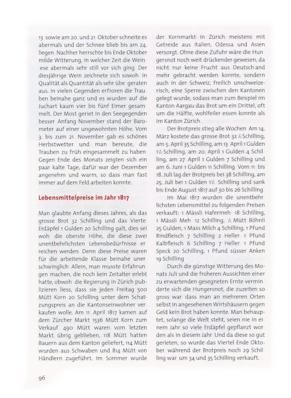 Man glaubte Anfang dieses Jahres, als das grosse Brot 32 Schilling und das Viertel Erdäpfel 1 Gulden 20 Schilling galt, dies sei wohl die oberste Höhe, die diese zwei unentbehrlichsten Lebensbedürfnisse erreichen werden. Denn diese Preise waren für die arbeitende Klasse beinahe unerschwinglich. Allein, man musste Erfahrungen machen, die noch kein Zeitalter erlebt hatte, obwohl die Regierung in Zürich publizieren liess, dass sie jeden Freitag 500 Mütt Korn 20 Schilling unter dem Schatzungspreis an die Kantonseinwohner verkaufen wolle. Am 11. April 1817 kamen auf dem Zürcher Markt 1536 Mütt Korn zum Verkauf. 490 Mütt waren vom letzten Markt übrig geblieben, 118 Mütt hatten Bauern aus dem Kanton geliefert, 114 Mütt wurden aus Schwaben und 814 Mütt von Händlern zugeführt. Im Sommer wurde der Kornmarkt in Zürich meistens mit Getreide aus Italien, Odessa und Asien versorgt. Ohne diese Zufuhr wäre die Hungersnot noch weit drückender gewesen, da nicht nur keine Frucht aus Deutschland mehr gebracht werden konnte, sondern auch in der Schweiz, freilich unschweizerisch, eine Sperre zwischen den Kantonen gelegt wurde, sodass man zum Beispiel im Kanton Aargau das Brot um ein Drittel, oft um die Hälfte, wohlfeiler essen konnte als im Kanton Zürich. Der Brotpreis stieg alle Wochen. Am 14. März kostete das grosse Brot 32½ Schilling, am 5. April 35 Schilling, am 13. April 1 Gulden 1½ Schilling, am 20. April 1 Gulden 4 Schilling, am 27. April 1 Gulden 7 Schilling und am 6. Juni 1 Gulden 11 Schilling.