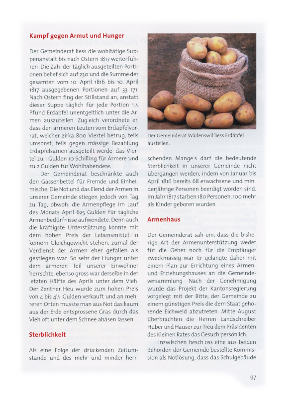 Zum Abschluss die Jahres 1817 mag als traurige Merkwürdigkeit und zum Andenken bemerkt werden, welche Opfer die hiesige Gemeinde für ihre Armen – verursacht durch die beispiellose Teuerung – zu bringen hatte. Es wurden nämlich gemäss Armenrechnungen und Registern an die in diesem Jahr unterstützungsbedürftig gewordenen 800 hiesigen Armen 10‘000 Gulden ausgegeben: 8000 Gulden an Bargeld; 1200 Gulden für zirka 41‘000 Portionen Suppe; 530 Gulden für Mehl; 170 Gulden für Brot; 100 Gulden für Erdäpfel. Dazu kamen 1500 Gulden für den Umbau des Schulhauses zur Armenanstalt.