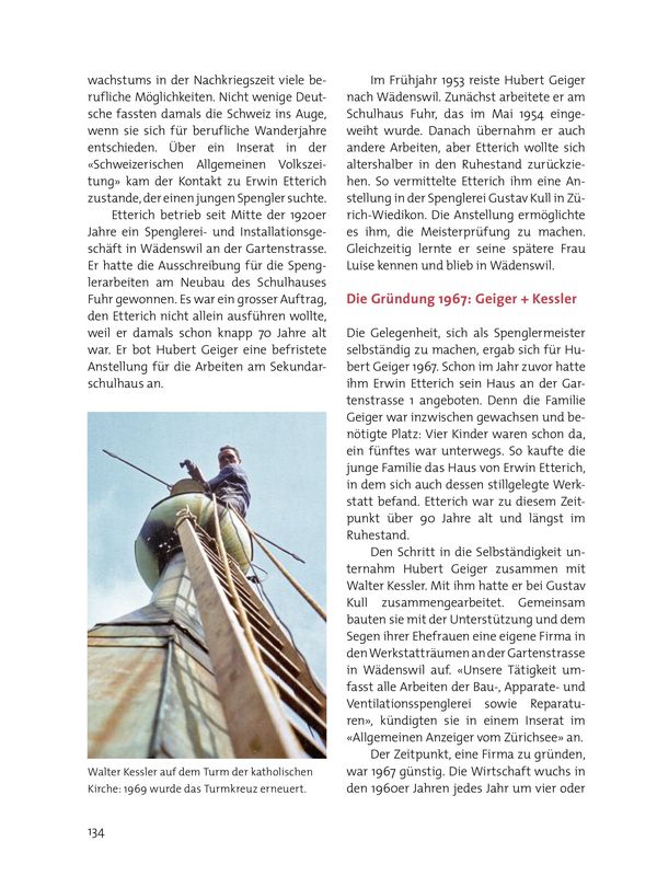 Den Schritt in die Selbständigkeit unternahm Hubert Geiger zusammen mit Walter Kessler. Mit ihm hatte er bei Gustav Kull zusammengearbeitet. Gemeinsam bauten sie mit der Unterstützung und dem Segen ihrer Ehefrauen eine eigene Firma in den Werkstatträumen an der Gartenstrasse in Wädenswil auf. «Unsere Tätigkeit umfasst alle Arbeiten der Bau-, Apparate- und Ventilationsspenglerei sowie Reparaturen», kündigten sie in einem Inserat im «Allgemeinen Anzeiger vom Zürichsee» an.