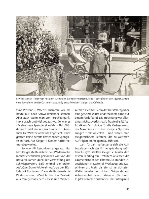 135 Erwin Etterich – hier 1935 mit dem Turmhahn der reformierten Kirche – betrieb seit den 1920er Jahren eine Spenglerei an der Gartenstrasse. 1967 erwarb Hubert Geiger das Gebäude.
