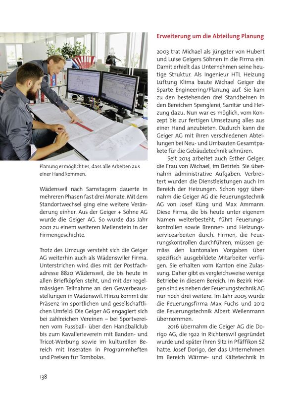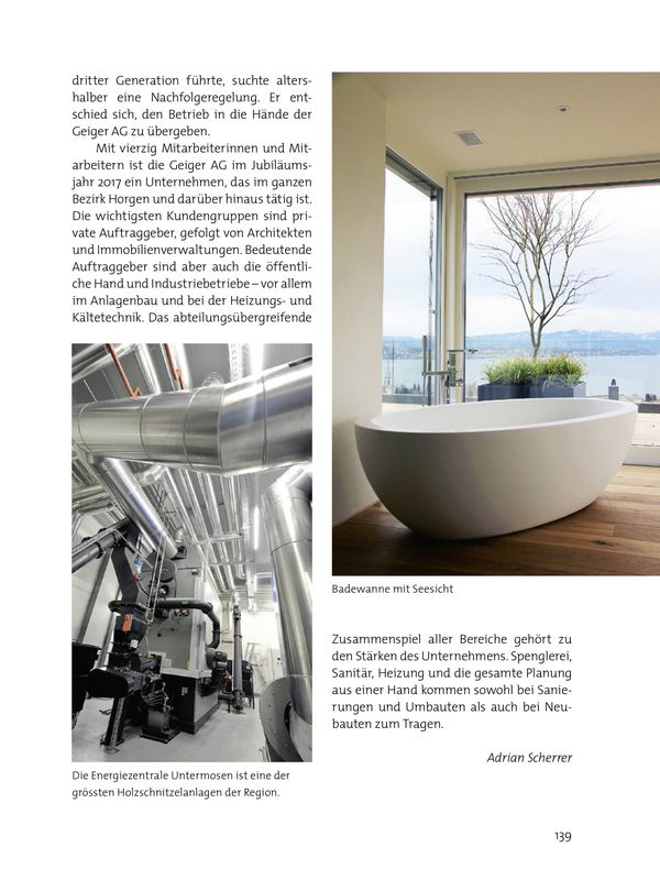Mit vierzig Mitarbeiterinnen und Mitarbeitern ist die Geiger AG im Jubiläumsjahr 2017 ein Unternehmen, das im ganzen Bezirk Horgen und darüber hinaus tätig ist. Die wichtigsten Kundengruppen sind private Auftraggeber, gefolgt von Architekten und Immobilienverwaltungen. Bedeutende Auftraggeber sind aber auch die öffentliche Hand und Industriebetriebe – vor allem im Anlagenbau und bei der Heizungs- und Kältetechnik. Das abteilungsübergreifende Zusammenspiel aller Bereiche gehört zu den Stärken des Unternehmens. Spenglerei, Sanitär, Heizung und die gesamte Planung aus einer Hand kommen sowohl bei Sanierungen und Umbauten als auch bei Neubauten zum Tragen.