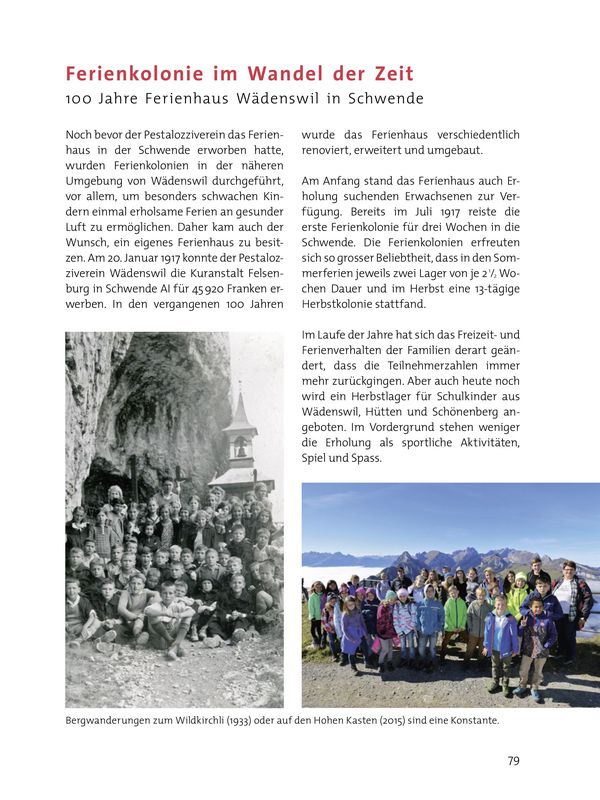 Pestalozziverein das Ferienhaus in der Schwende erworben hatte, wurden Ferienkolonien in der nähere Umgebung von Wädenswil durchgeführt, vor allem, um besonders schwachen Kindern einmal erholsame Ferien an gesunder Luft zu ermöglichen. Daher kam auch der Wunsch, ein eigenes Ferienhaus zu besitzen. Am 20. Januar 1917 konnte der Pestalozziverein Wädenswil die Kuranstalt Felsenburg in Schwende AI für 45‘920 Franken erwerben. In den vergangenen 100 Jahren wurde das Ferienhaus verschiedentlich renoviert, erweitert und umgebaut.