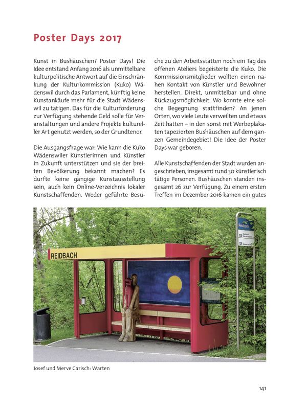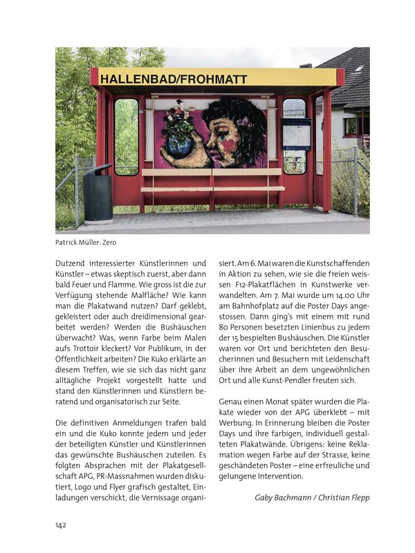 Die definitiven Anmeldungen trafen bald ein und die Kuko konnte jedem und jeder der beteiligten Künstler und Künstlerinnen das gewünschte Bushäuschen zuteilen. Es folgten Absprachen mit der Plakatgesellschaft APG, PR-Massnahmen wurden diskutiert, Logo und Flyer grafisch gestaltet, Einladungen verschickt, die Vernissage organisiert. Am 6. Mai waren die Kunstschaffende in Aktion zu sehen, wie sie die freien weissen Fiz-Plakatflächen in Kunstwerke verwandelten. Am 7. Mai wurde um 14.00 Uhr am Bahnhofplatz auf die Poster Days angestossen. Dann ging's mit einem mit rund 80 Personen besetzten Linienbus zu jeder der 15 bespielten Bushäuschen. Die Künstle waren vor Ort und berichteten den Besucherinnen und Besuchern mit Leidenschaft über ihre Arbeit an dem ungewöhnlichen Ort und alle Kunst-Pendler freuten sich.