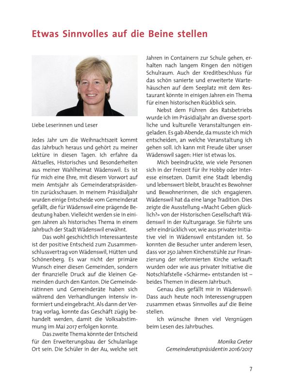 Jahrbuch heraus und gehört zu meiner Lektüre in diesen Tagen. Ich erfahre da Aktuelles, Historisches und Besonderheiten aus meiner Wahlheimat Wädenswil. Es ist für mich eine Ehre, mit diesem Vorwort auf mein Amtsjahr als Gemeinderatspräsidentin zurückschauen.