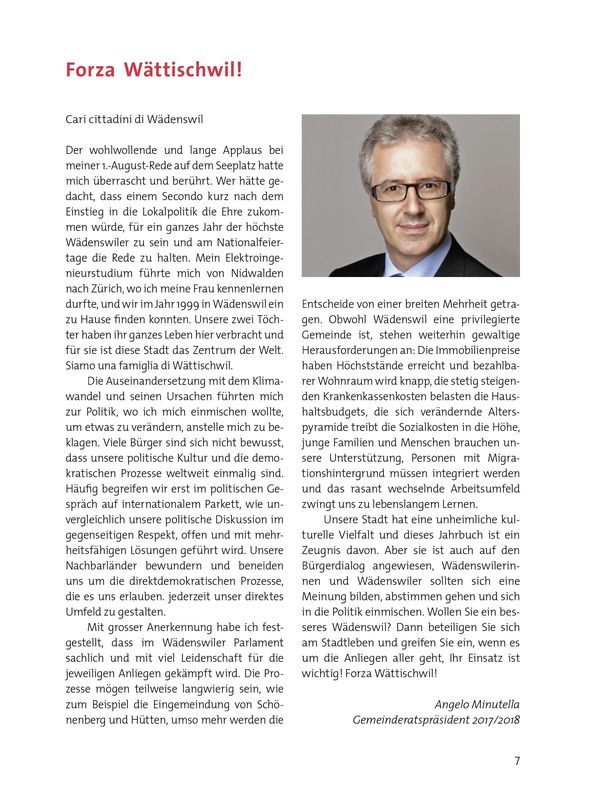 dieses Jahrbuch ist ein Zeugnis davon. Aber sie ist auch auf den Bürgerdialog angewiesen, Wädenswilerinnen und Wädenswiler sollten sich eine Meinung bilden, abstimmen gehen und sich in die Politik einmischen. Wollen Sie ein besseres Wädenswil? Dann beteiligen Sie sich am Stadtleben und greifen Sie ein wenn es um die Anliegen Aller geht, Ihr Einsatz ist wichtig! FORZA WÄTTISCHWYL!