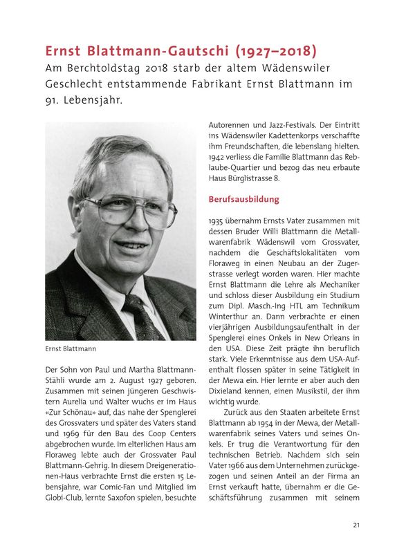 Am Berchtoldstag 2018 starb der altem Wädenswiler Geschlecht entstammende Fabrikant Ernst Blattmann im 91. Lebensjahr.